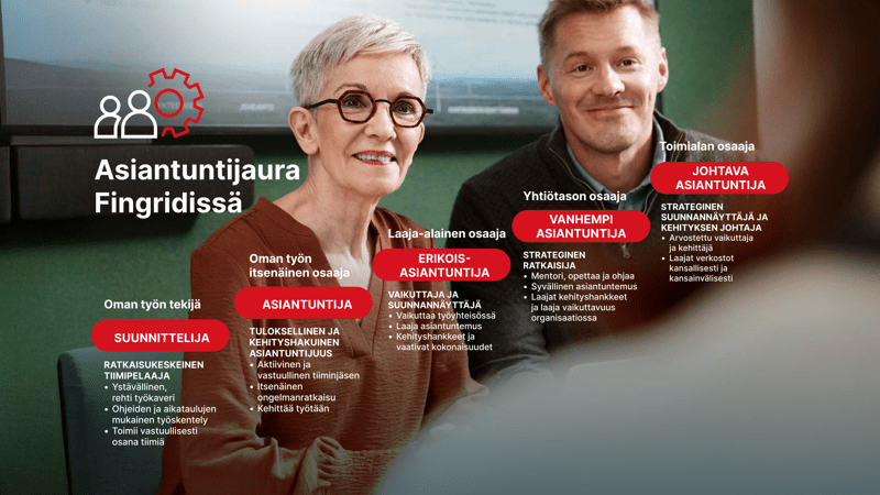 Fingridillä työskentelee joukko oman alansa asiantuntijoita. Haluamme kannustaa osaamisen kehittämiseen niin omalla substanssialueella kuin myös työyhteisötaidoissa. Tunnistamme asiantuntijuuden arvon ja haluamme tarjota työntekijöillemme mahdollisuuden edetä perinteisen esihenkilöpolun lisäksi myös asiantuntijana. Alla näet kuvauksen asiantuntijauramme tasoista.